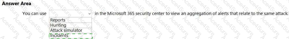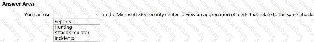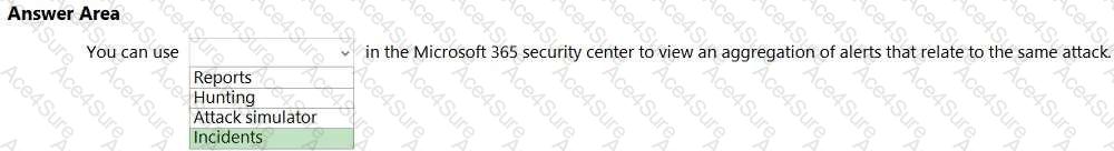 This is distinct from other areas in the portal: Reports provide trend and posture reporting; Hunting offers proactive, query-based threat hunting across raw data; and Attack simulator (in Defender for Office 365) is used to run training and awareness simulations (e.g., phishing), not to aggregate real alerts. Therefore, when you need to “view an aggregation of alerts that relate to the same attack” in the Microsoft 365 security center, the correct place is Incidents, which presents the correlated attack story and enables end-to-end response and remediation from a single, consolidated record.