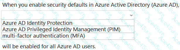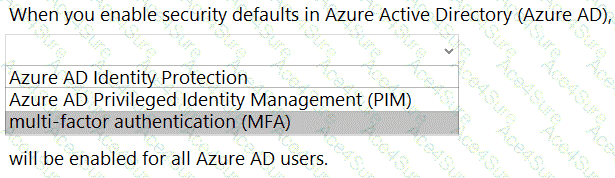 Microsoft states that Security defaults are baseline protections in Azure Active Directory (now Microsoft Entra ID) that “make it easier to help protect your organization from identity-related attacks.” One of the core behaviors is that security defaults “require all users to register for Azure AD Multi-Factor Authentication,” and enforce “multi-factor authentication for all users,” with special emphasis that “administrators are required to do multi-factor authentication.” Security defaults also “block legacy authentication” and add protections for privileged operations, but the universal control that applies to every user is MFA. Importantly, enabling security defaults does not turn on paid capabilities such as Azure AD Identity Protection or Privileged Identity Management (PIM); those are separate, premium features. The baseline is intentionally simple and tenant-wide: require MFA registration, challenge with MFA when risk or sensitive operations are detected, and reduce exposure by disabling legacy protocols. Therefore, when you enable security defaults, multi-factor authentication (MFA) will be enabled for all Azure AD users, aligning with Microsoft’s guidance that security defaults “help protect all organizations by requiring MFA and disabling legacy authentication.”