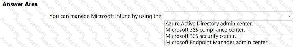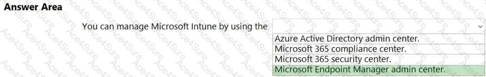 By contrast, the Azure Active Directory admin center (Microsoft Entra admin center) is designed for identity and access tasks (users, groups, roles, Conditional Access), not full device/app management. The Microsoft 365 compliance center is focused on data governance and risk (DLP, information protection, eDiscovery, audit), while the Microsoft 365 security center/Defender portal is for security operations and threat protection. Therefore, when the sentence states, “You can manage Microsoft Intune by using the…,” the correct completion—aligned with Microsoft SCI study materials—is Microsoft Endpoint Manager admin center, the portal intentionally built for Intune device and app lifecycle management.