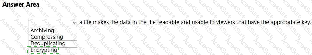 This aligns precisely with the sentence: encrypting a file makes the data readable and usable to viewers that have the appropriate key (and unreadable to those who do not). By contrast, archiving organizes or preserves data for long-term storage; compressing reduces file size without controlling access; and deduplicating removes redundant copies to save space. None of these provide the key-based, identity-bound access control described in Microsoft SCI materials. Therefore, the correct completion is Encrypting.