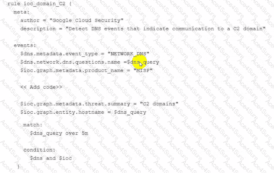 You are implementing Google Security Operations (SecOps) for your organization. Your organization has their own threat intelligence feed that has been ingested to Google SecOps by using a native integration with a Malware Information Sharing Platform (MISP). You are working on the following detection rule to leverage the command and control (C2) indicators that were ingested into the entity graph.
