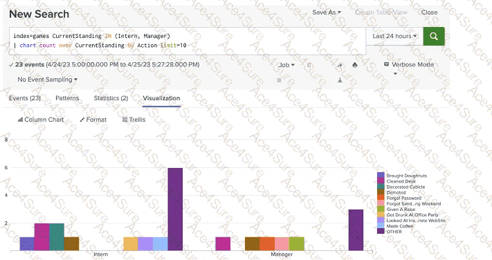 D. | chart count over CurrentStanding by Action limit-10This command has a syntax error (limit-10 should be limit=10) and does not include the useother=f clause. Therefore, it would not remove the 'OTHER' category, making it incorrect.