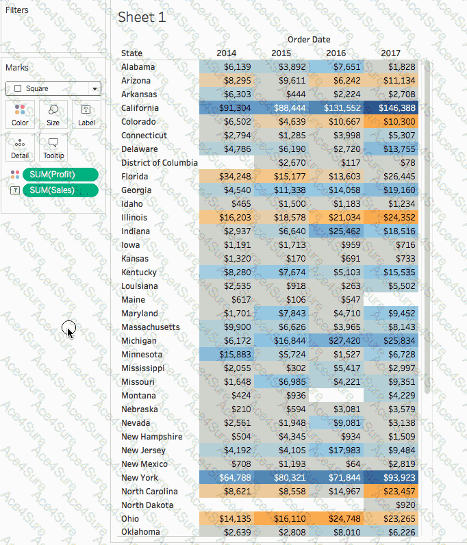 6) From the Data pane, under Measures, drag Profit to Color on the Marks Card.