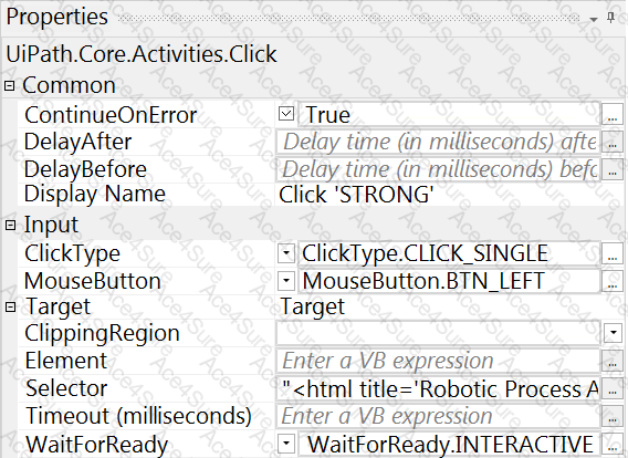 A developer configured the properties for a Click activity on an element inside a web page as shown in the exhibit. An animation on the web page never completely loads but the element specified in the Click activity does.
