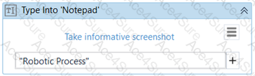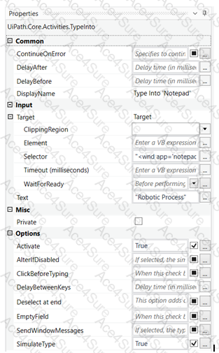A developer executes the following Type Into activity to enter some text into a Notepad. What will be written in the Notepad once the activity is executed?