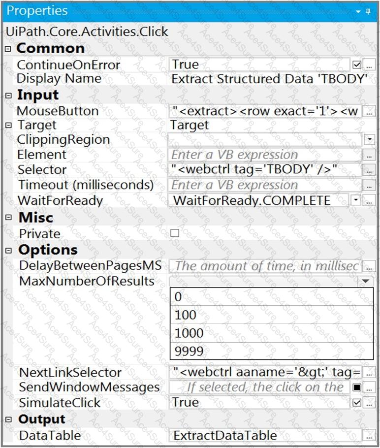 A developer has created a project to scrape structured data from Service Desk tickets. Upon review, the developer discovered that the Extract Structured Data activity was set to retrieve 50 results. The activity needs to be updated to retrieve all available results.