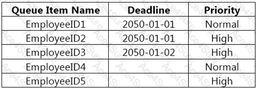 Based on the exhibit that represents the "Deadline" in the yyyy-mm-dd format, what is the correct sequence in which the Queue Items are processed by a single Performer workflow?