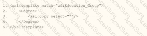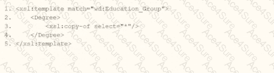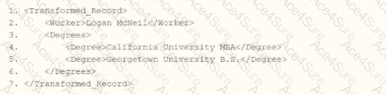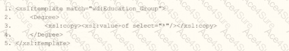 In Workday integrations, XSLT is used to transform XML data, such as the output from a web service-enabled report or EIB, into a desired format for third-party systems. In this scenario, you need to create an XSLT template that matches the wd:Education_Group element in the provided XML and transforms it to produce the degree data in the format shown in the Transformed_Record example. The goal is to output each degree (e.g., "California University MBA" and "Georgetown University B.S.") as a element within a parent element.
