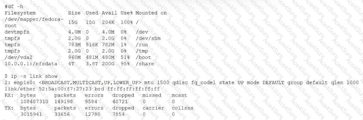 Although the df -h output shows that the NFS filesystem is 95% full, this alone does not typically cause random disconnections. A nearly full filesystem may lead to write failures or performance degradation, but it does not explain intermittent connectivity loss. Linux+ V8 documentation notes that filesystem capacity issues usually present as I/O errors, not transport-layer disconnects.